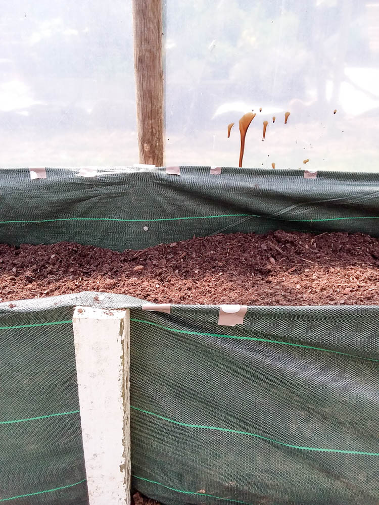 A few weeks ago I decided to create a cheap raised bed in the poly-tunnel, the benefits being that you need to water less often than for peat bags or pots, ideal if you are going away for a few days in the middle of summer. The other benefit is that you can give the growing medium new life every year with new compost, which you can not do so easily in the soil, plus you can totally change it every 3 or 4 years if it get infected with with diseases, or to totally regenerate the growing medium.